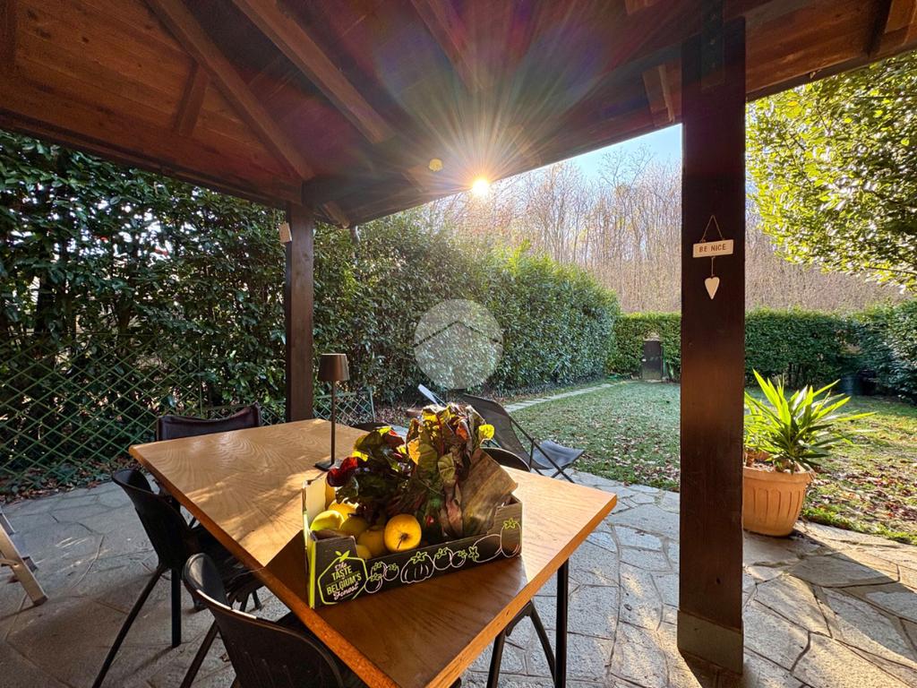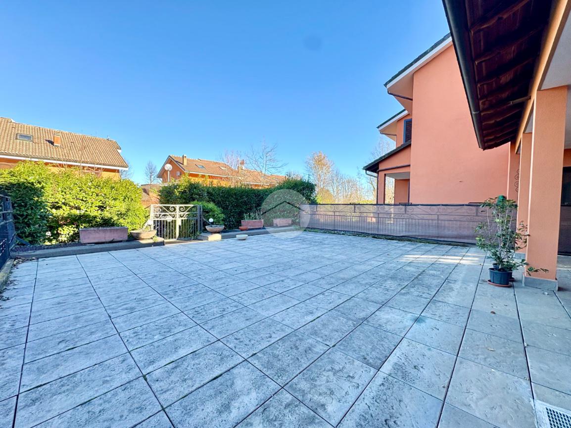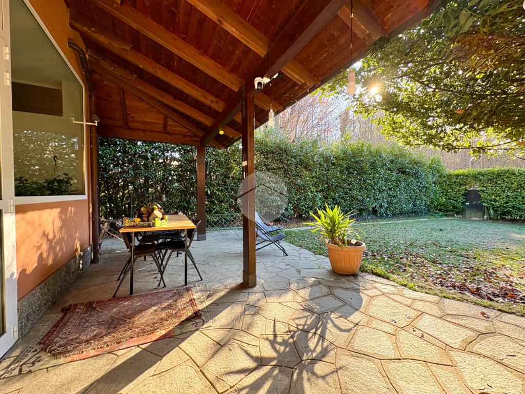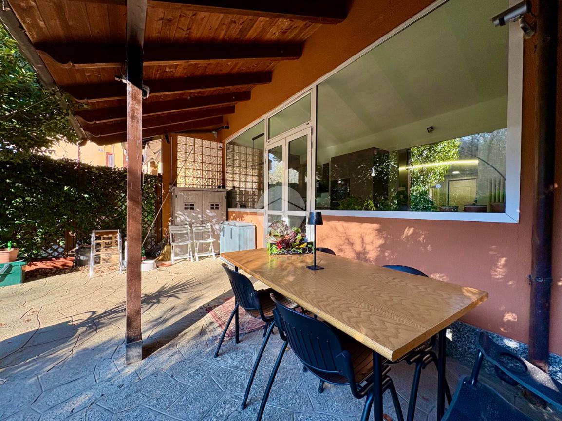 L'ingresso avviene tramite uno spazioso cortile privato che introduce alla zona giorno, situata al piano terra e composta da soggiorno, studio, un pratico bagno al piano, cucina abitabile caratterizzata da ampie vetrate e con accesso diretto al giardino impreziosito da un portico, perfetto per i momenti di relax all'aperto.
